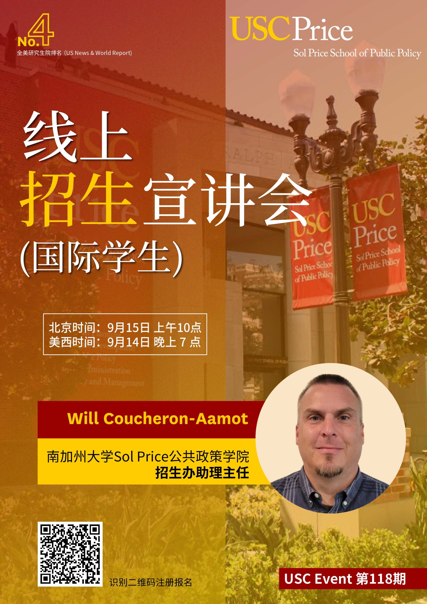 欢迎参加2023年9月15日北京时间上午10:00南加州大学Sol Price公共政策学院举办的在线讲座《线上招生宣讲会(国际学生)》。马上注册!