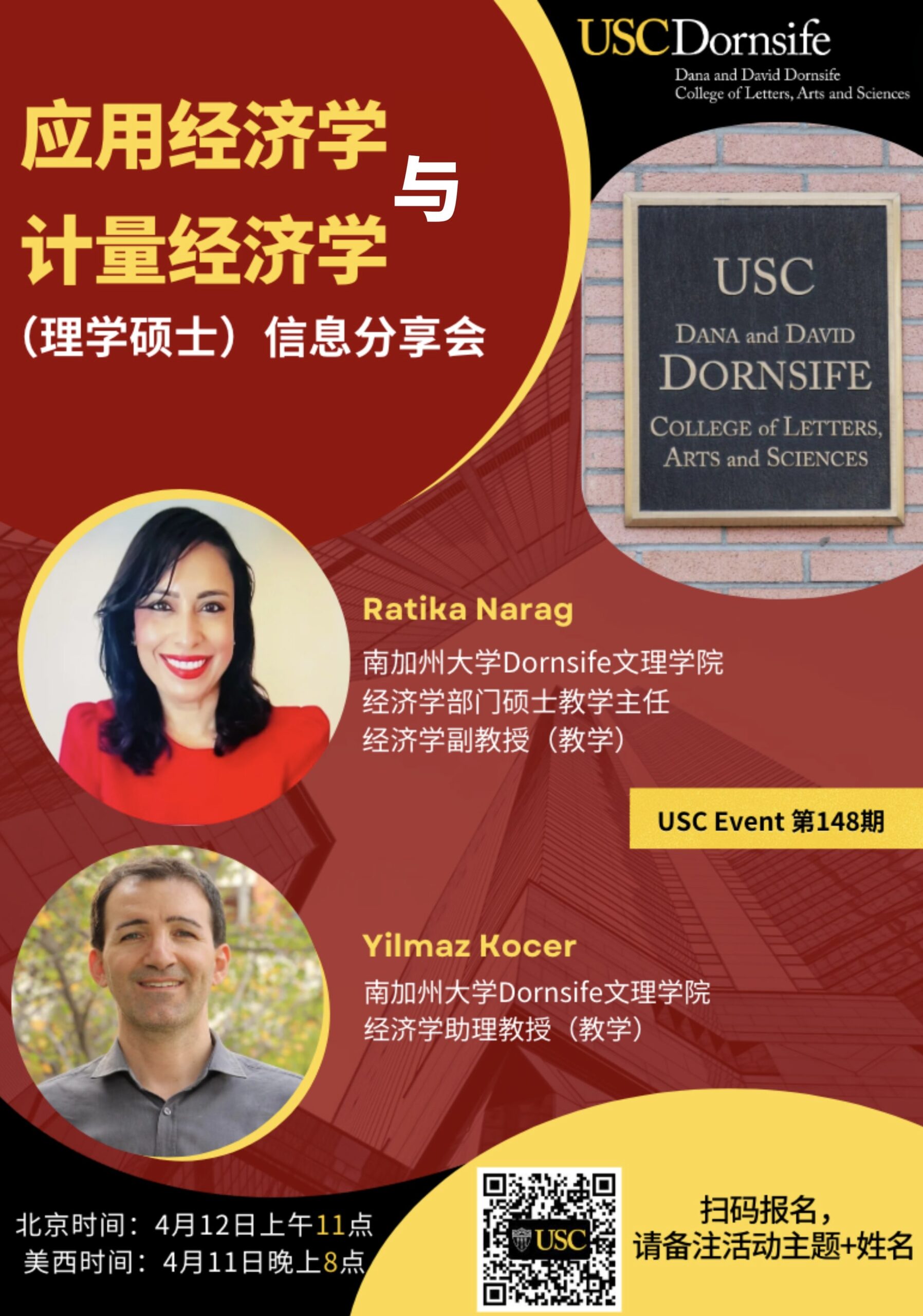 欢迎参加2024年4月12日北京时间上午11:00南加州大学Dornsife文理学院举办的在线讲座《应用经济学与计量经济学(理学硕士)信息分享会》。马上注册!