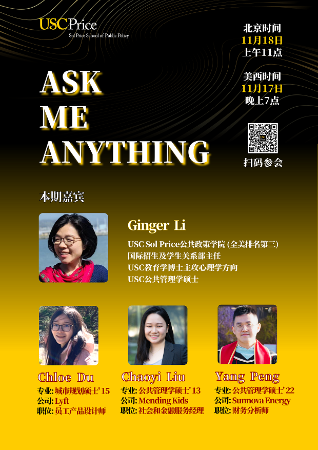 欢迎参加2022年11月18日北京时间上午11:00南加州大学Sol Price国际公共政策学院举办的在线讲座《Ask Me Anything!》。马上注册!