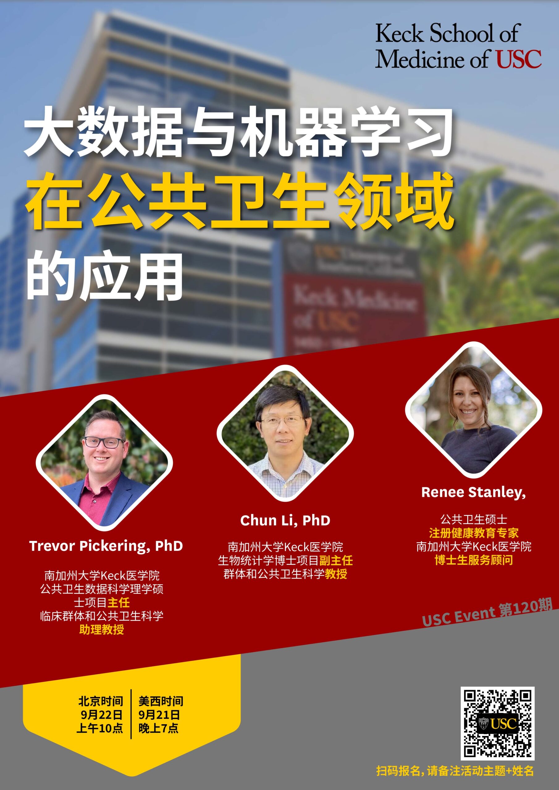 欢迎参加2023年9月22日北京时间上午10:00南加州大学Keck医学院举办的在线讲座《大数据与机器学习在公共卫生领域的应用》。马上注册!