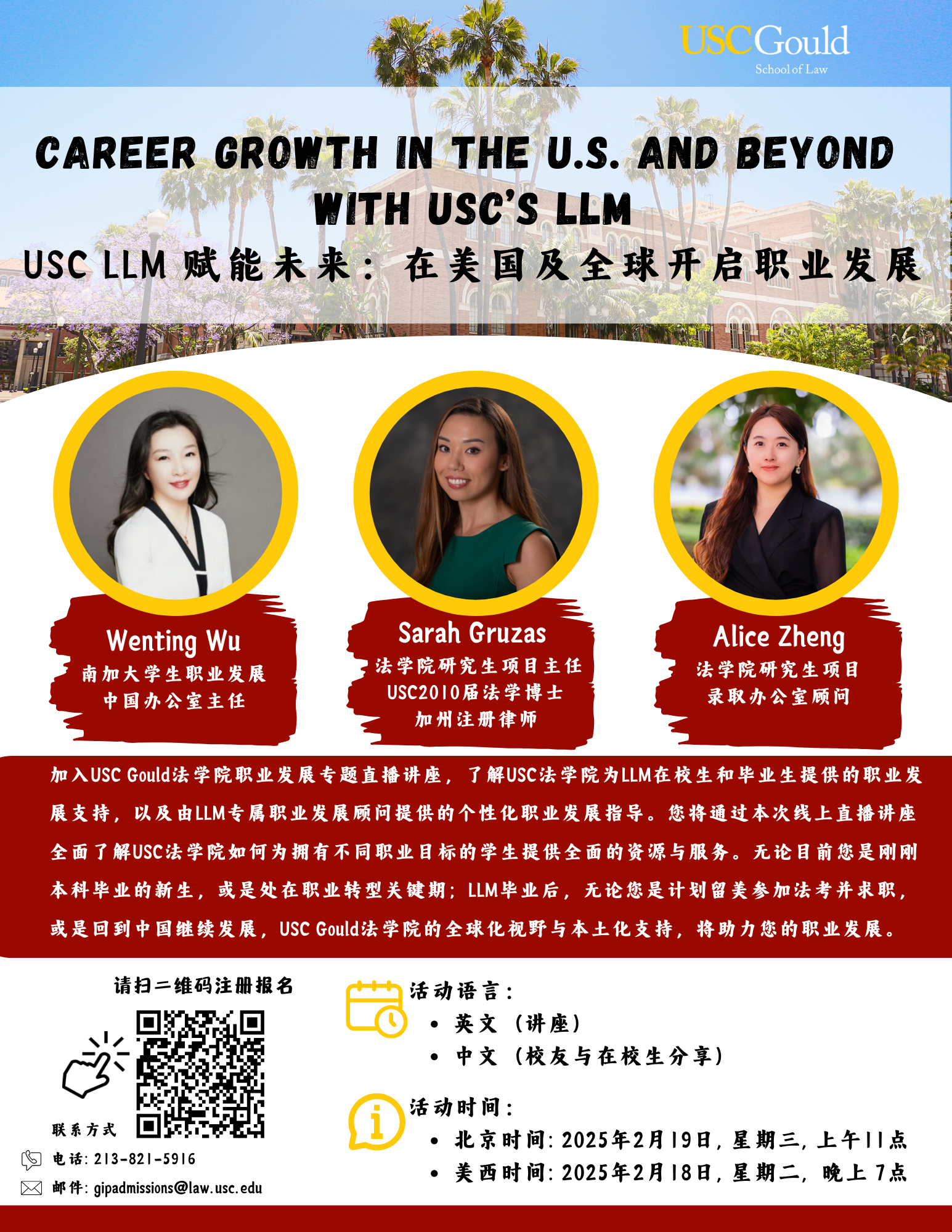 欢迎参加2025年2月19日北京时间上午11:00南加州大学 Gould 法学院举办的在线讲座《USC Event第197期-USC LLM 赋能未来:在美国及全球开启职业发展》。马上注册!