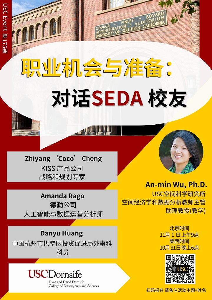 欢迎参加2024年11月1日北京时间上午11:00南加州大学Dornsife文理学院举办的在线讲座《职业机会与准备: 对话SEDA 校友》。马上注册!