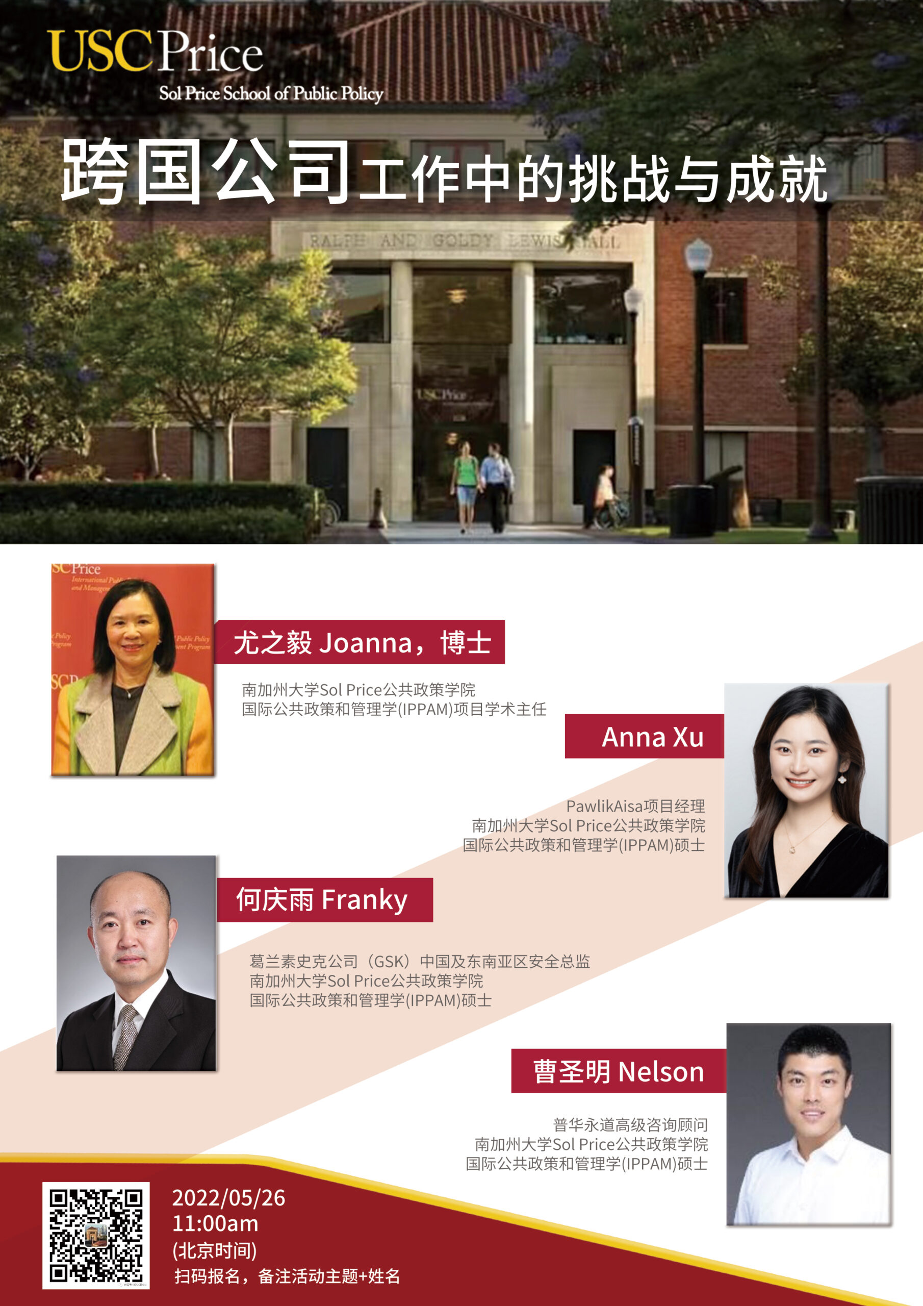 欢迎参加2022年5月26日北京时间上午11:00南加州大学Sol Price国际公共政策学院举办的在线讲座《跨国公司工作中的挑战与成就》。马上注册!