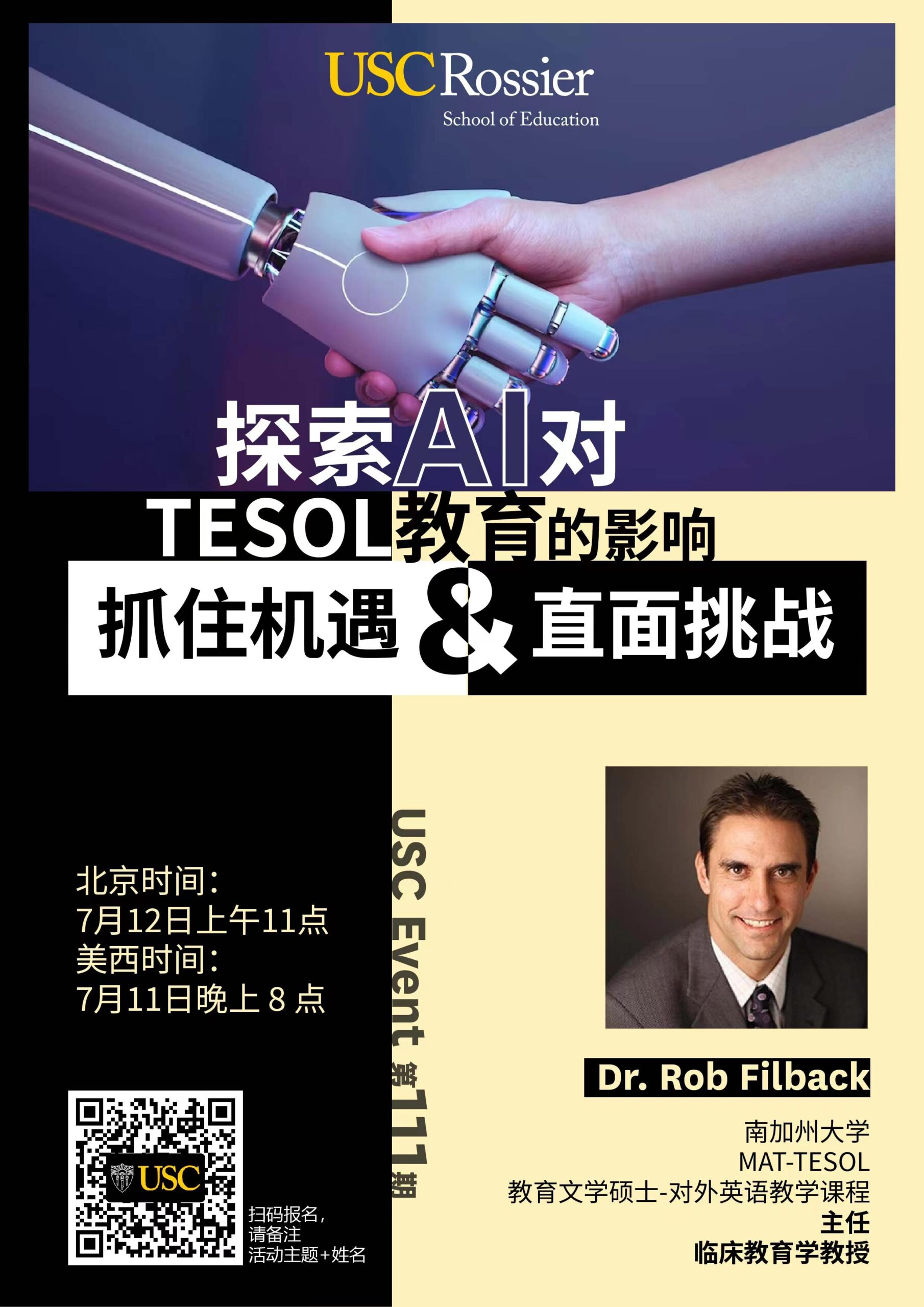 欢迎参加2023年7月12日北京时间上午11:00南加州大学Rossier教育学院举办的在线讲座《探索AI对TESOL教育的影响:抓住机遇,直面挑战》。马上注册!