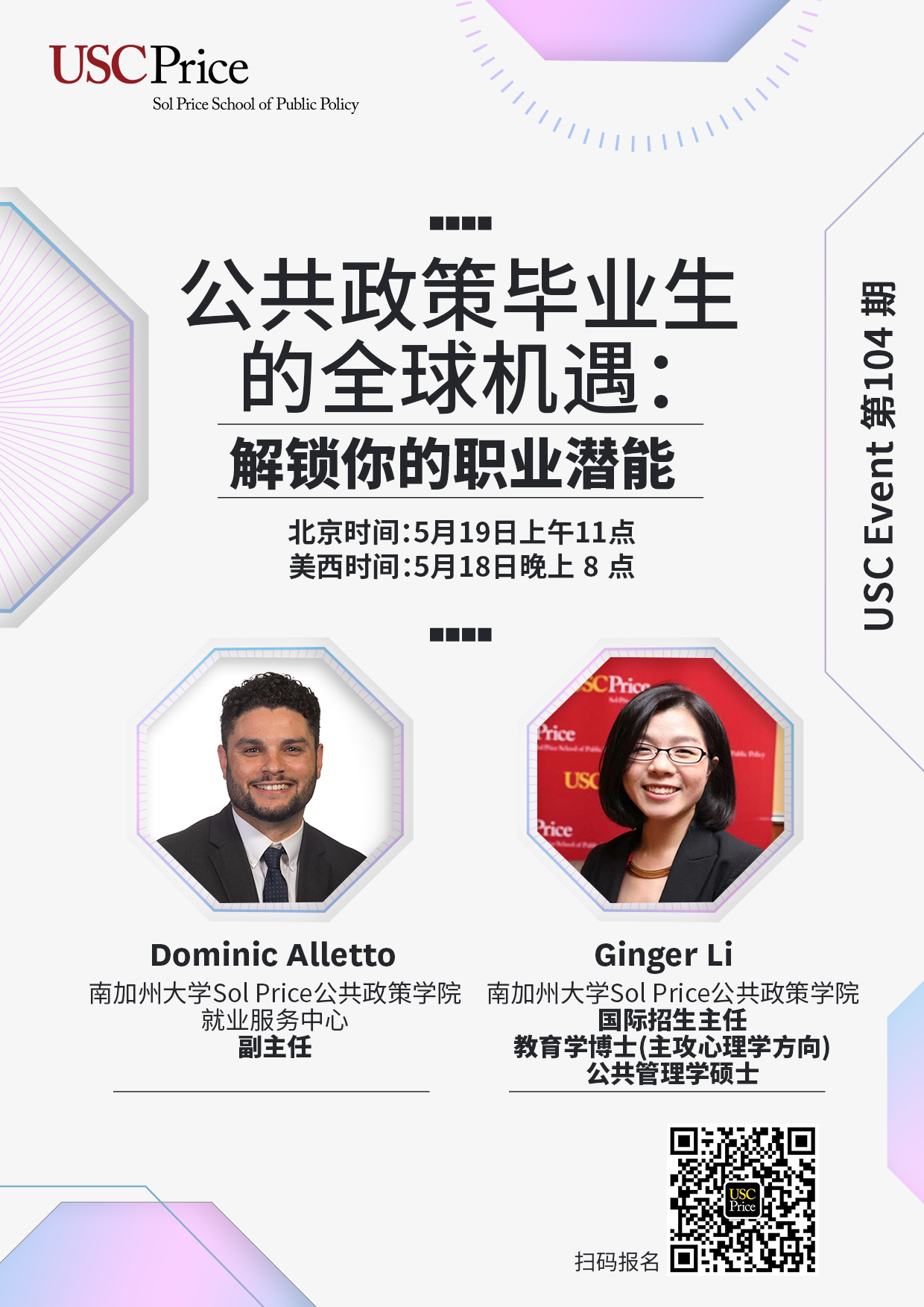 欢迎参加2023年5月19日北京时间上午11:00南加州大学Sol Price公共政策学院举办的在线讲座《公共政策毕业生的全球机遇: 解锁你的职业潜能》。马上注册!