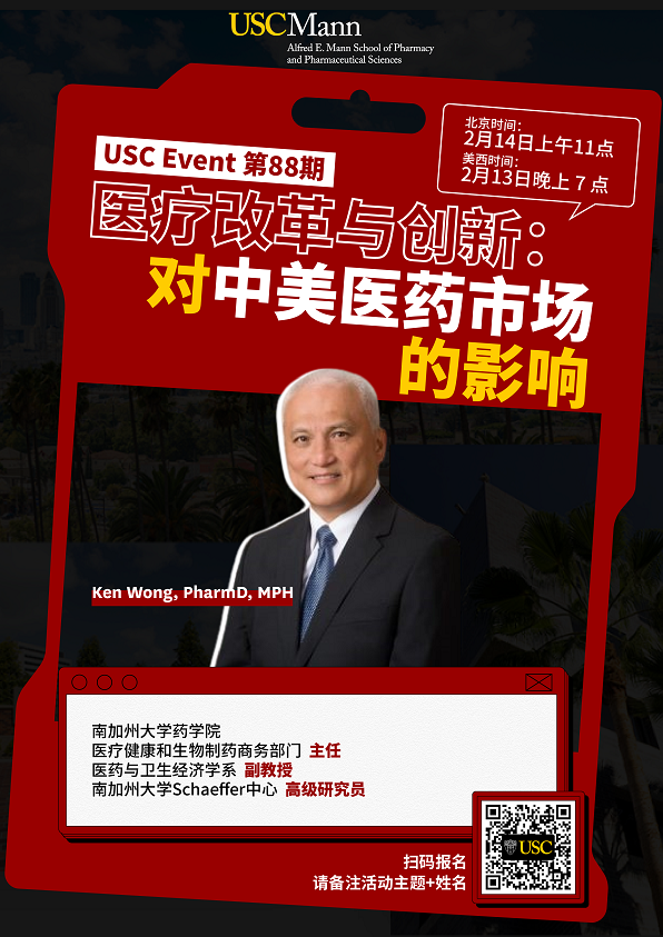 欢迎参加2023年2月14日北京时间上午11:00南加州大学 Mann 药学与药物科学学院举办的在线讲座《医疗改革与创新:对中美医药市场的影响》。马上注册!