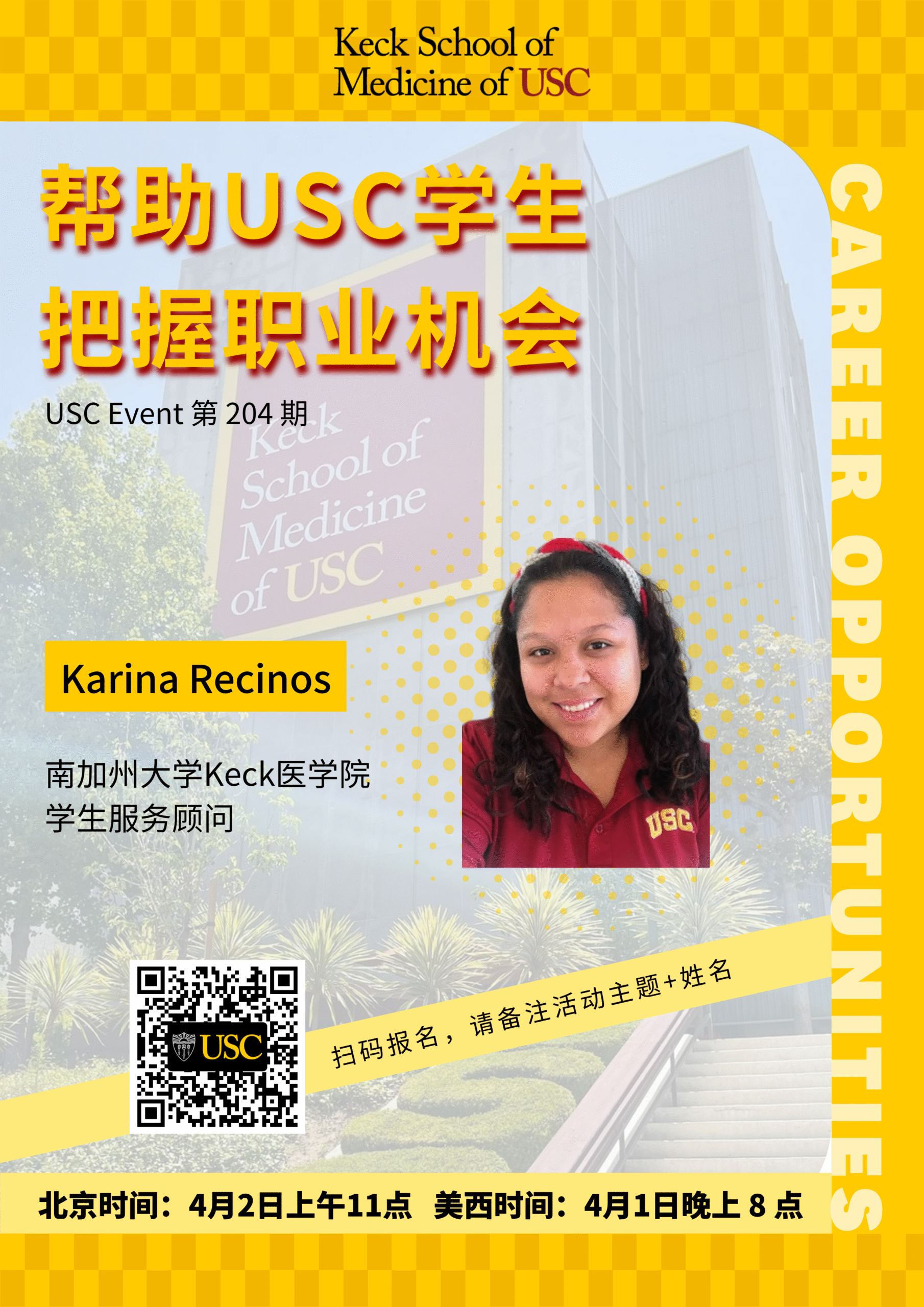 欢迎参加2025年4月2日北京时间上午11:00南加州大学 Keck 医学院举办的在线讲座《USC Event第 204 期-帮助USC学生把握职业机会》。马上注册!