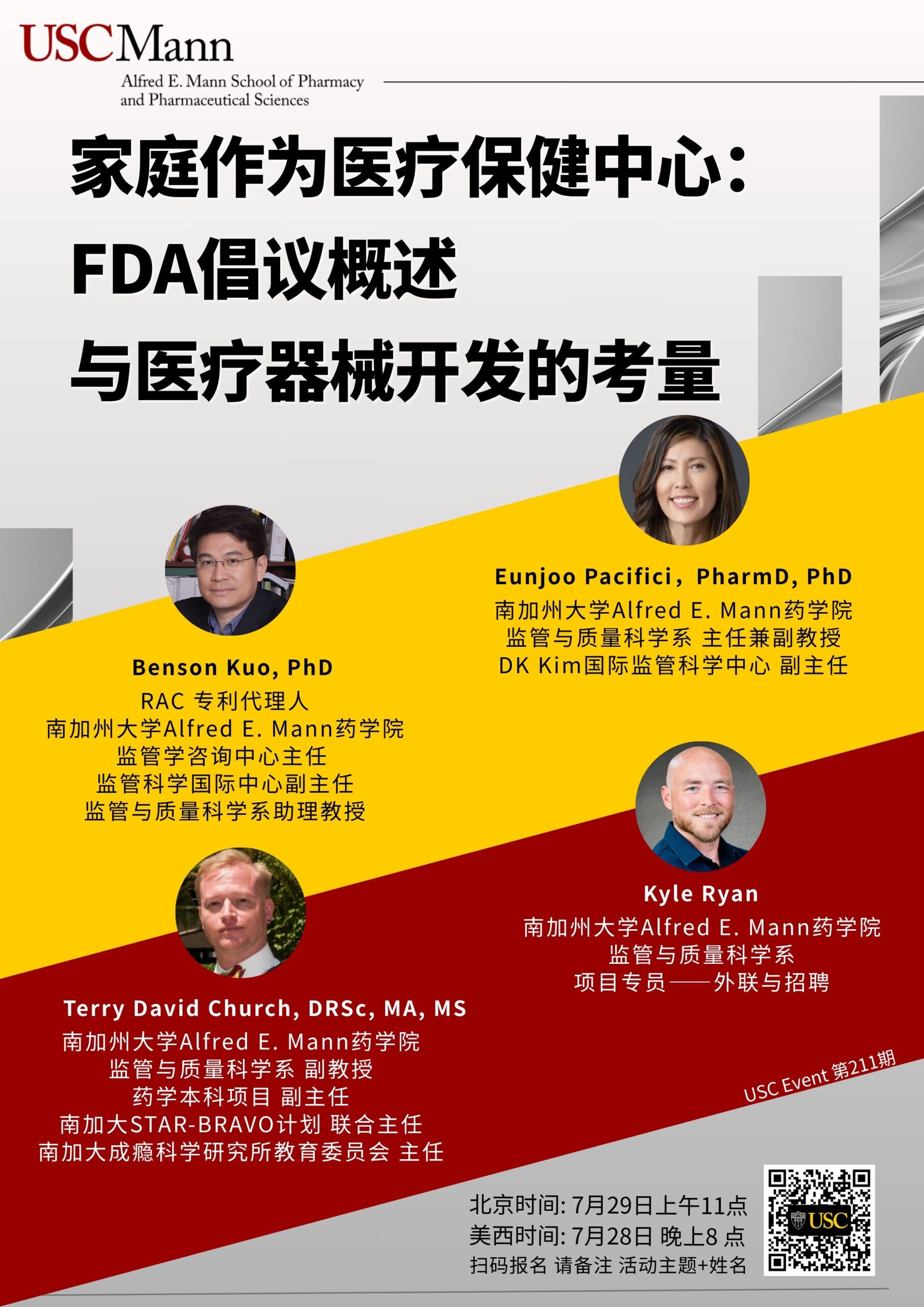 欢迎参加2025年7月29日北京时间上午11:00南加州大学 Mann 药学与药物科学学院举办的在线讲座《家庭作为医疗保健中心:FDA倡议概述与医疗器械开发的考量》。马上注册!