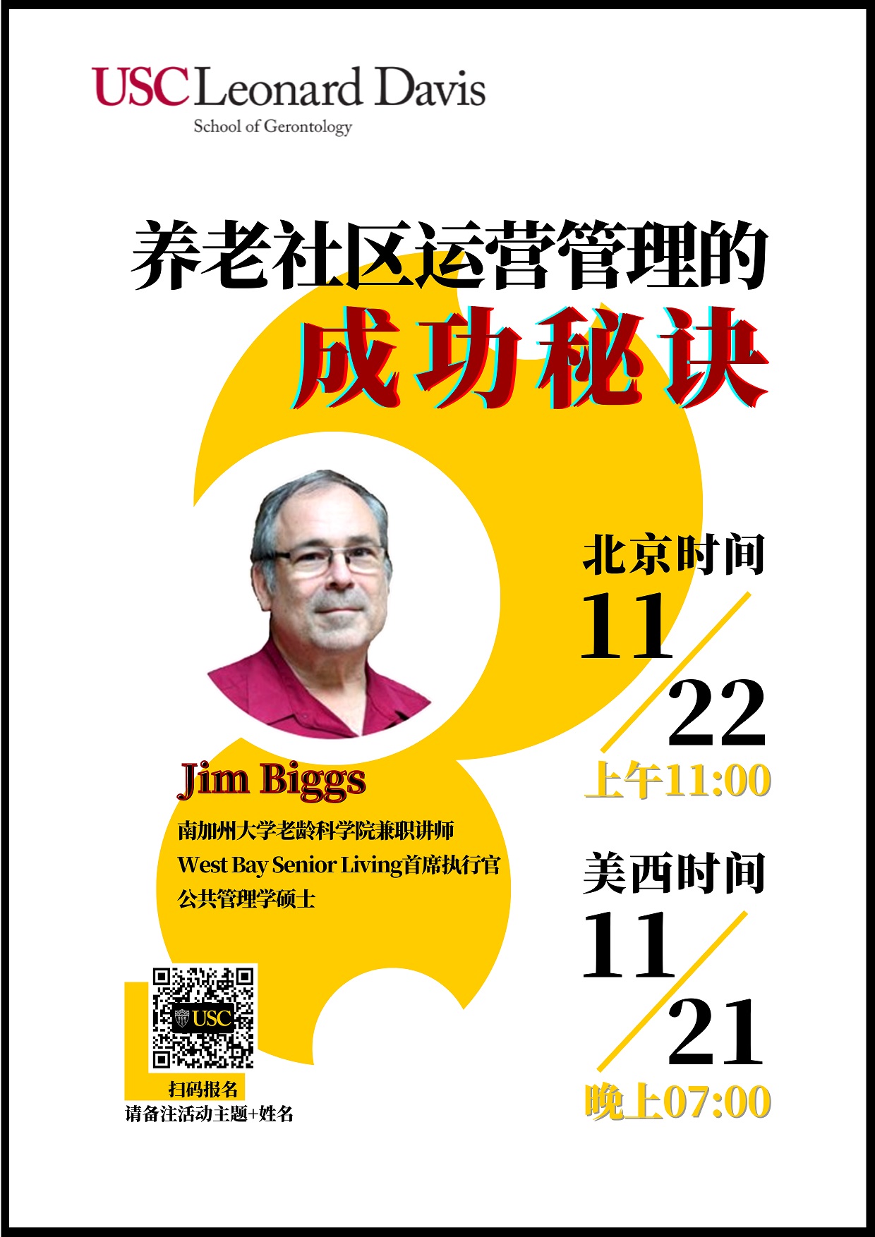 欢迎参加2022年11月22日北京时间上午11:00南加州大学Leonard Davis 老龄科学院举办的在线讲座《养老社区运营管理的成功秘诀》。马上注册!