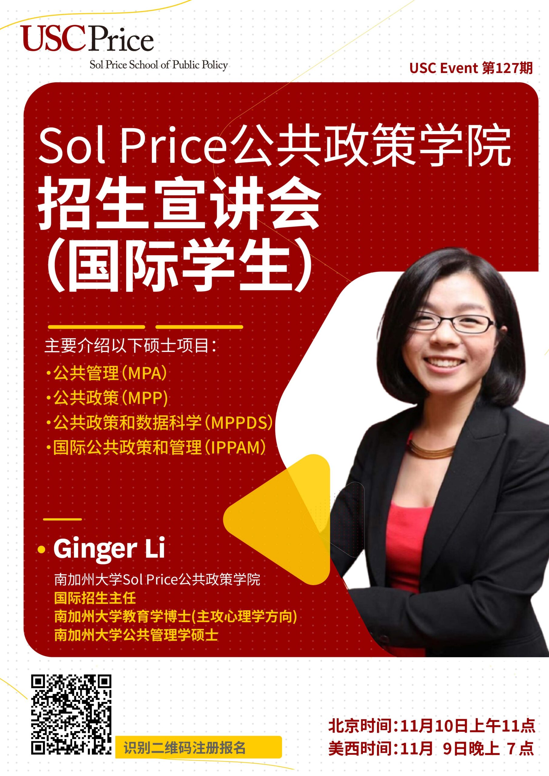 欢迎参加2023年11月10日北京时间上午11:00南加州大学Sol Price公共政策学院举办的在线讲座《Sol Price公共政策学院招生宣讲会(国际学生)》。马上注册!