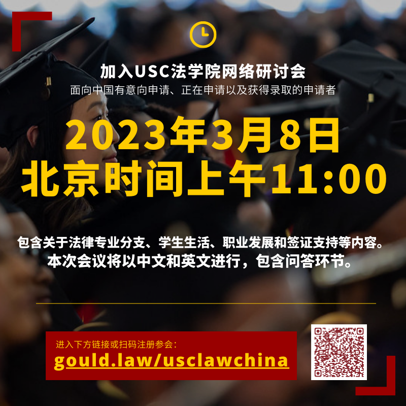 欢迎参加2023年3月8日北京时间上午11:00南加州大学法学院《USC法学院-中国地区线上研讨会》。马上注册!