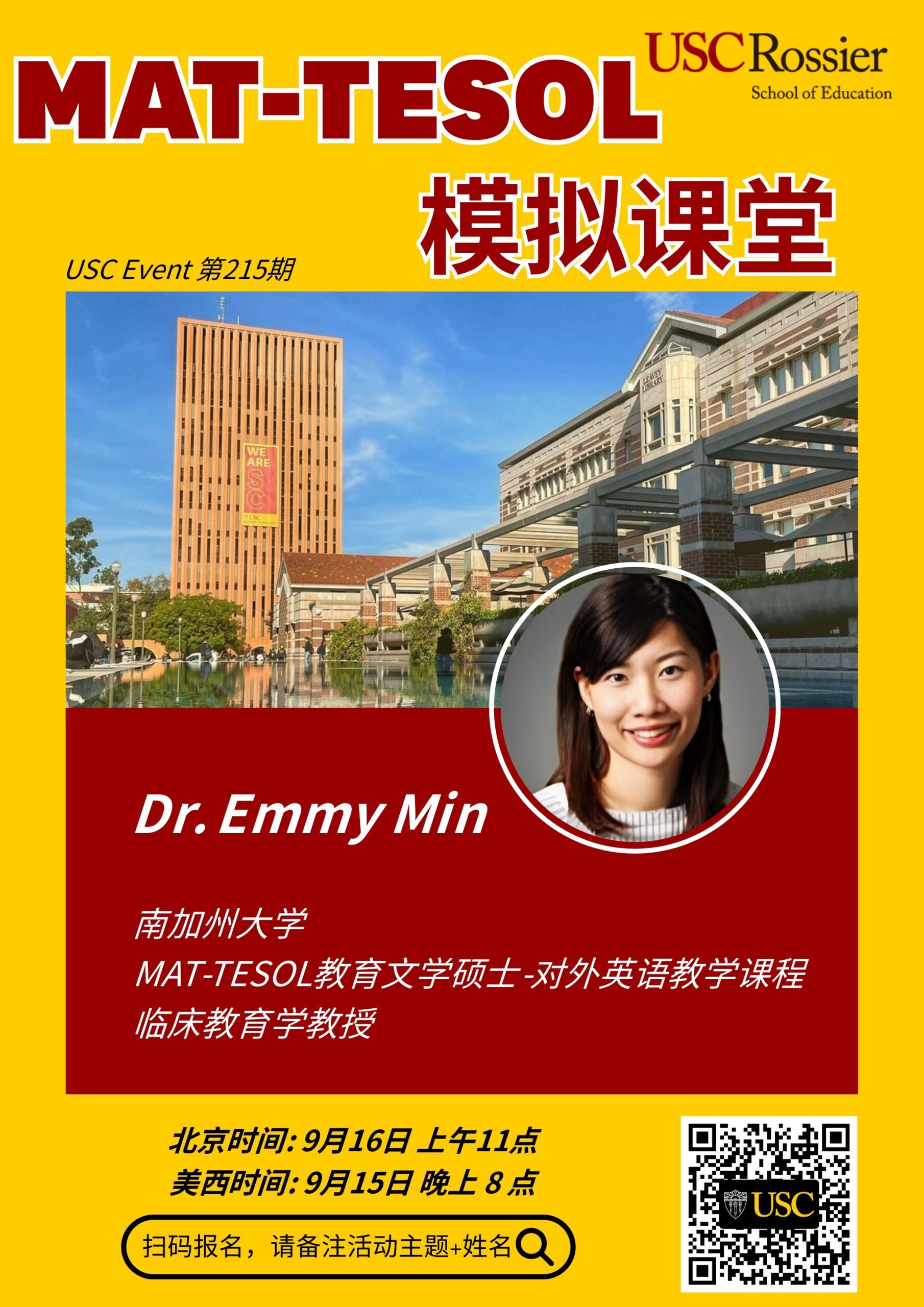 欢迎参加2025年9月16日北京时间上午11:00南加州大学Rossier教育学院举办的在线讲座《MAT-TESOL模拟课堂》。马上注册!