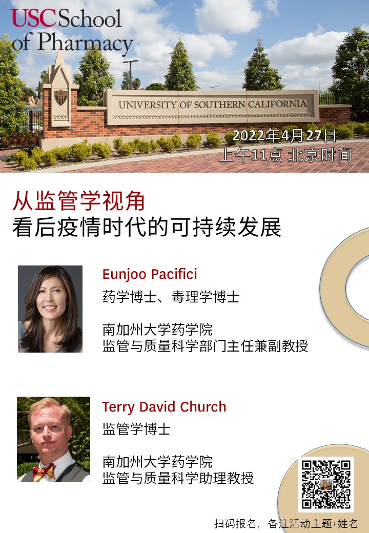 欢迎参加2022年4月27日北京时间上午11:00南加州大学Pharmacy药学院举办的在线讲座《从监管学视角看后疫情时代的可持续发展》。马上注册!