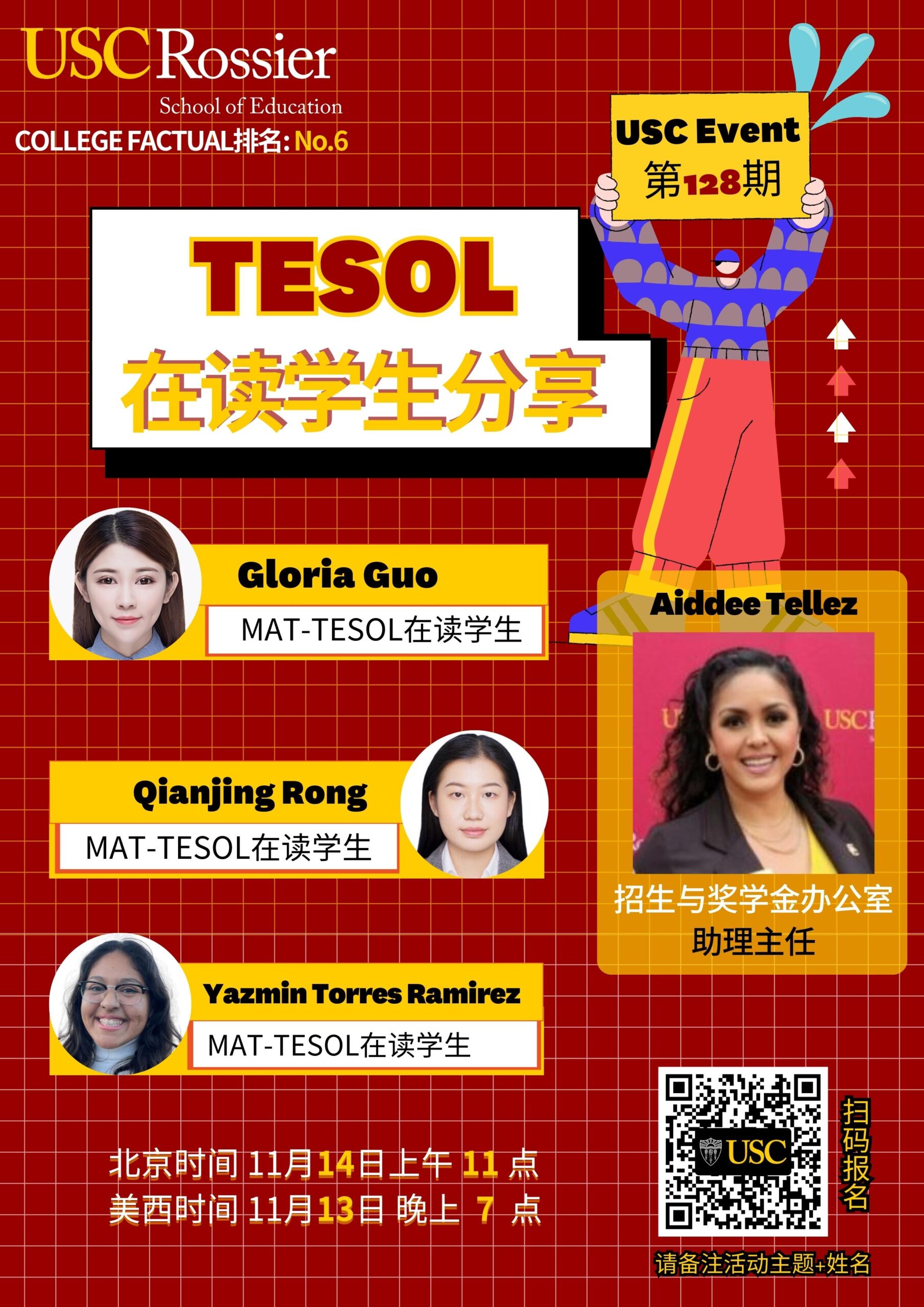 欢迎参加2023年11月14日北京时间上午11:00南加州大学Rossier教育学院举办的在线讲座《TESOL在读学生研讨会》。马上注册!
