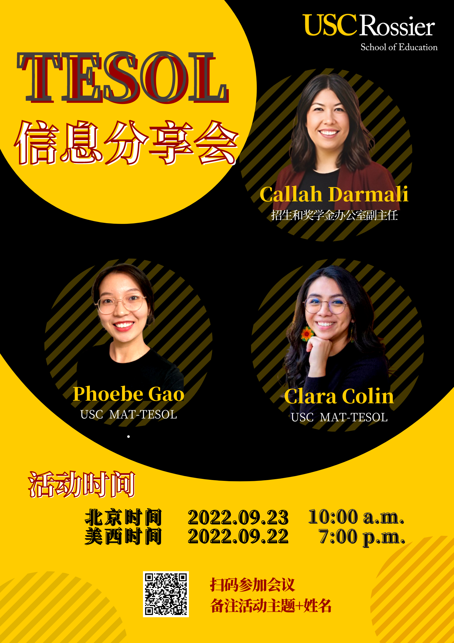 欢迎参加2022年9月23日北京时间上午10:00南加州大学Rossier教育学院举办的在线讲座《TESOL信息分享会》。马上注册!