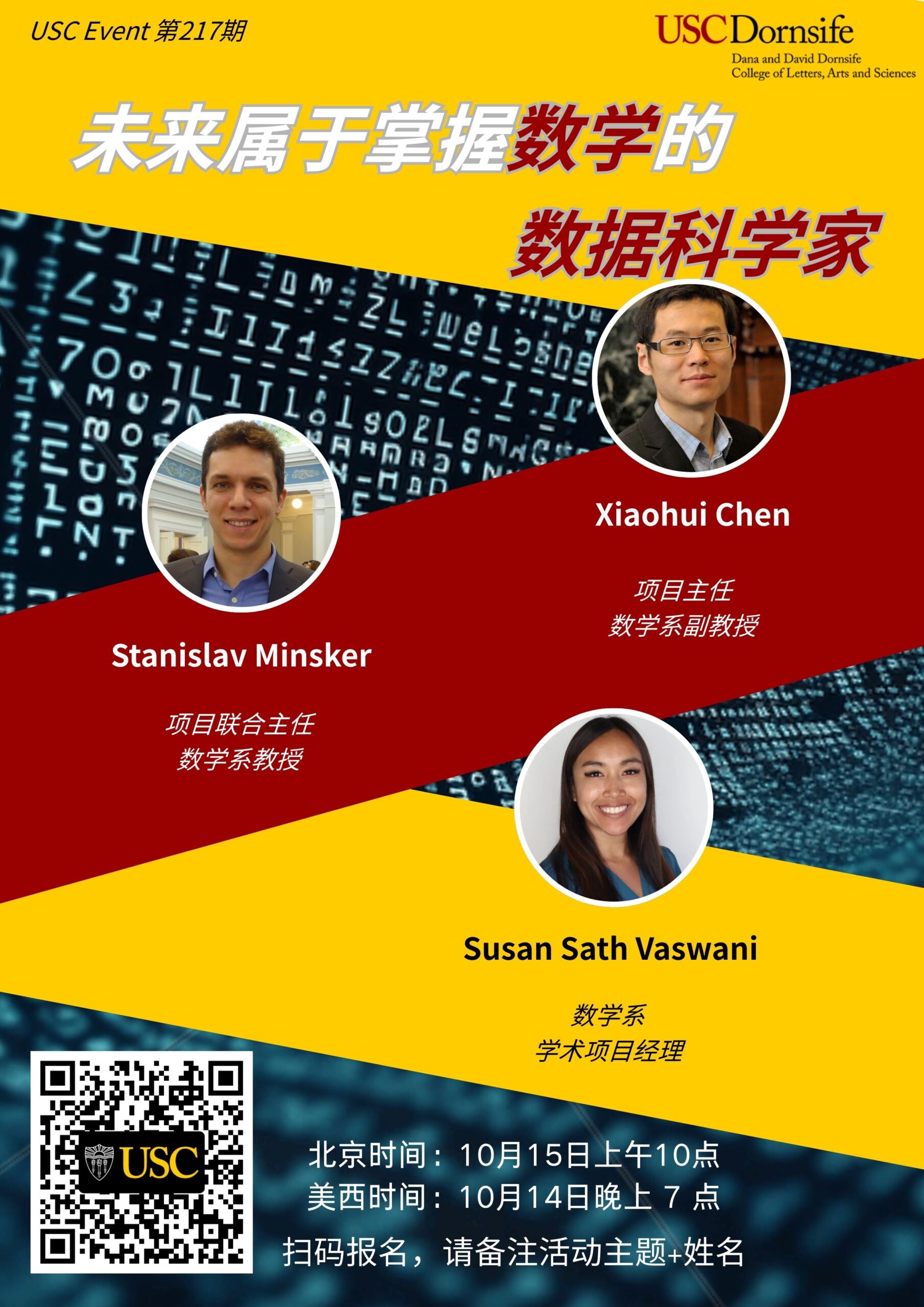 欢迎参加2025年10月15日北京时间上午11:00南加州大学Dornsife文理学院举办的在线讲座《USC Event第 217 期-未来属于掌握数学的数据科学家》。马上注册!