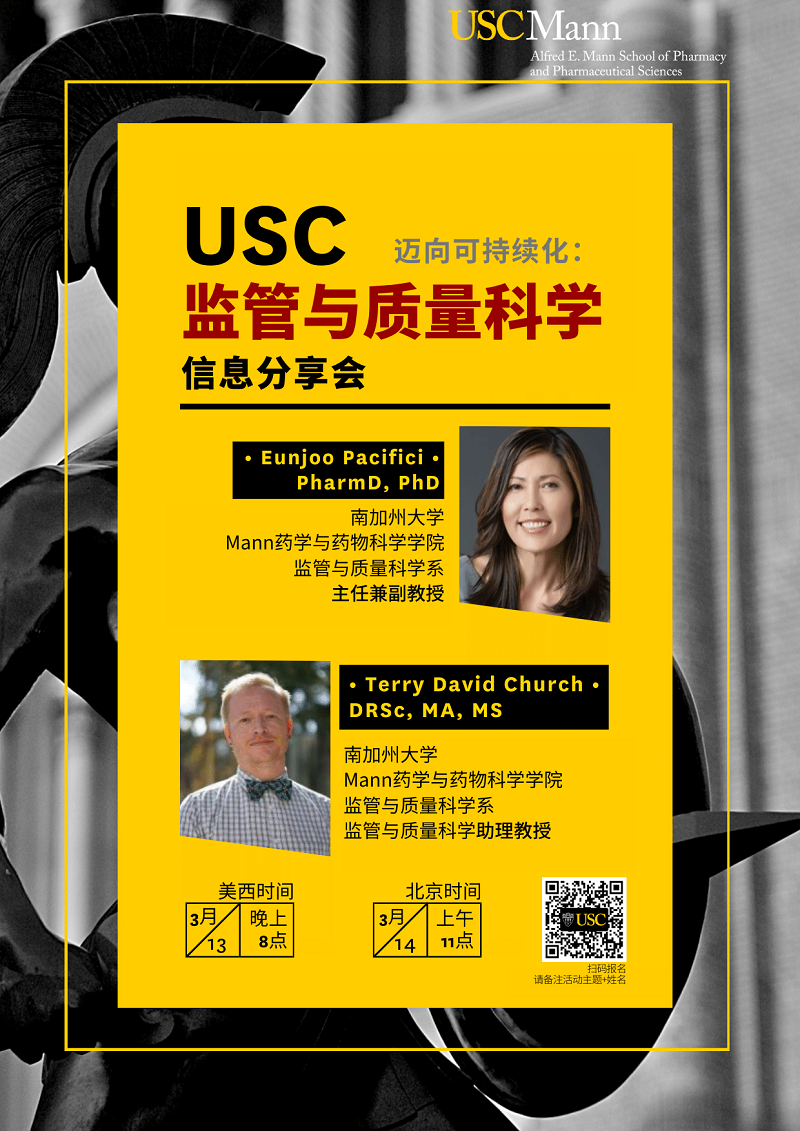 欢迎参加2023年3月14日北京时间上午11:00南加州大学 Mann 药学与药物科学学院举办的在线讲座《USC Event第92期-迈向可持续化:USC监管与质量科学信息分享会》。马上注册!