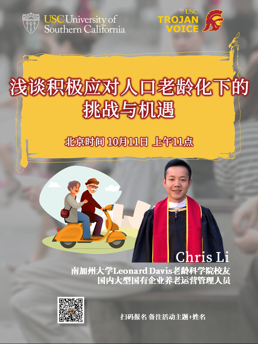 欢迎参加2022年10月11日北京时间上午11:00南加州大学国际学院举办的在线讲座《浅谈积极应对人口老龄化下的挑战与机遇》。马上注册!
