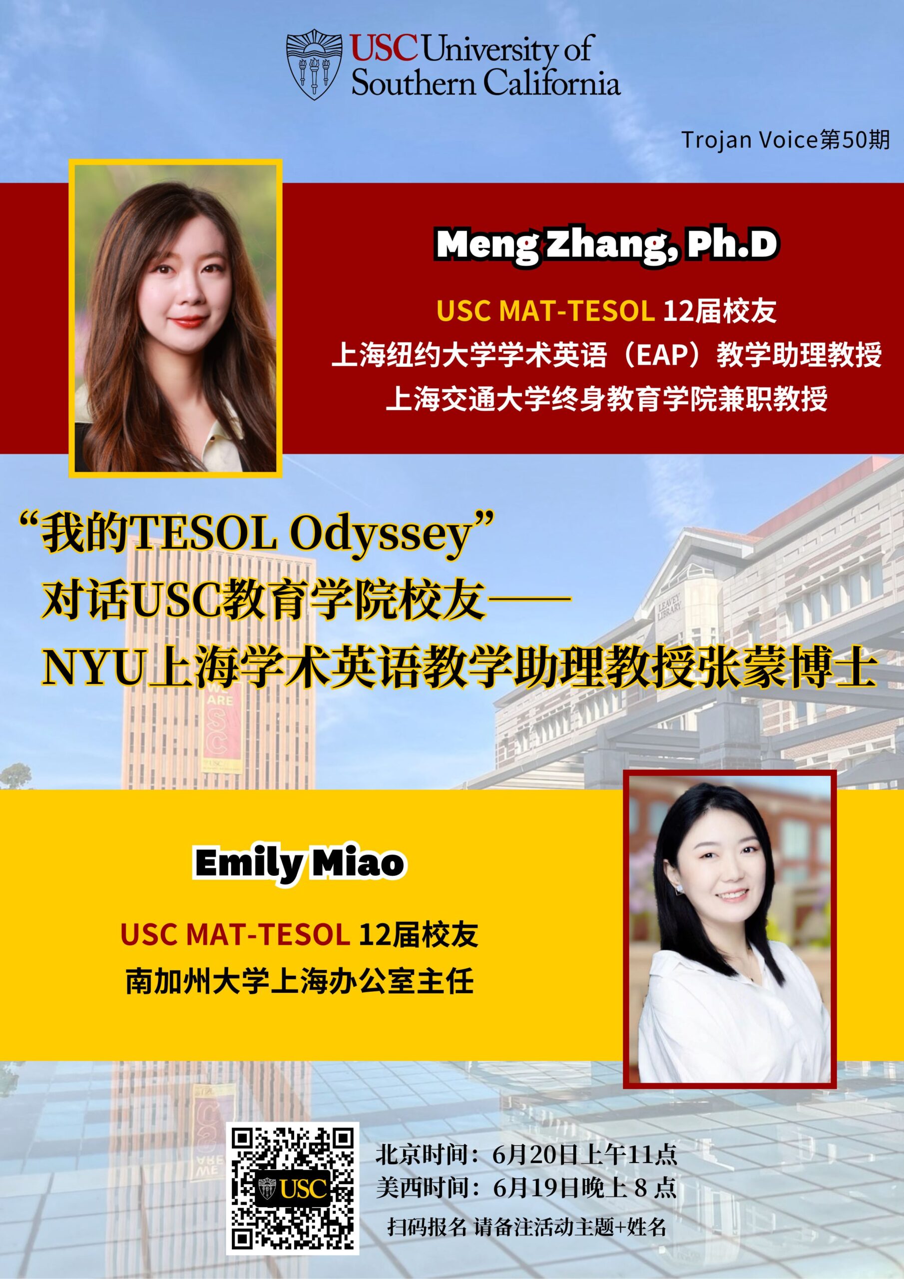 欢迎参加2024年6月20日北京时间上午11:00南加州大学国际学院举办的在线讲座《”我的TESOL Odyssey”对话USO教育学院校友NYU山海学术英语教学助理教授张蒙博士》。马上注册!