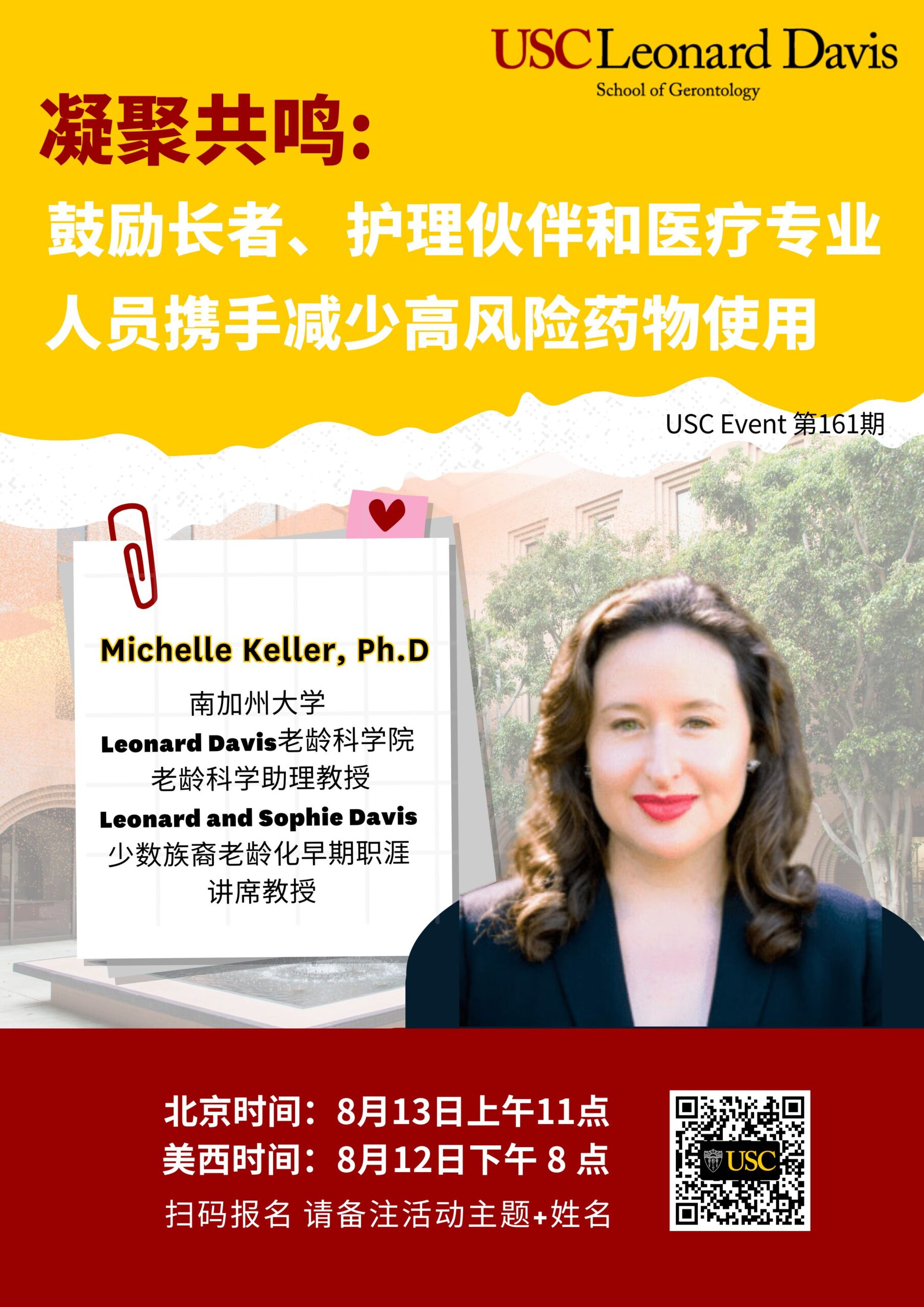 欢迎参加2024年8月13日北京时间上午11:00南加州大学Leonard Davis老龄学院举办的在线讲座《凝聚共鸣: 鼓励长者、护理伙伴和医疗专业人员携手减少高风险药物使用》。马上注册!