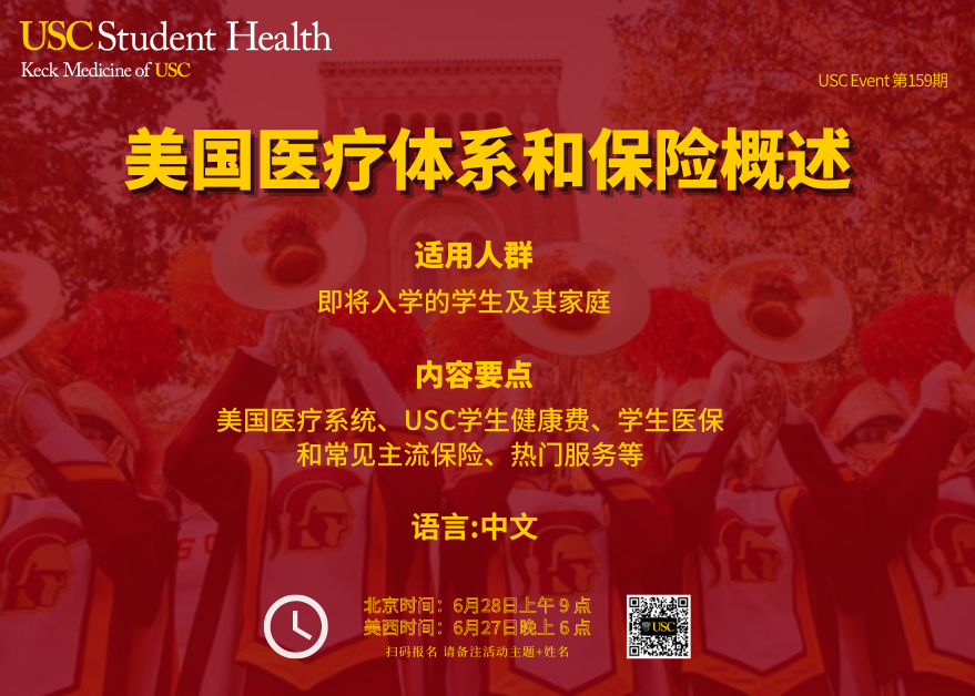 欢迎参加2024年6月28日北京时间上午9:00南加州大学Keck医学院举办的在线讲座《美国医疗体系和保险概述》。马上注册!