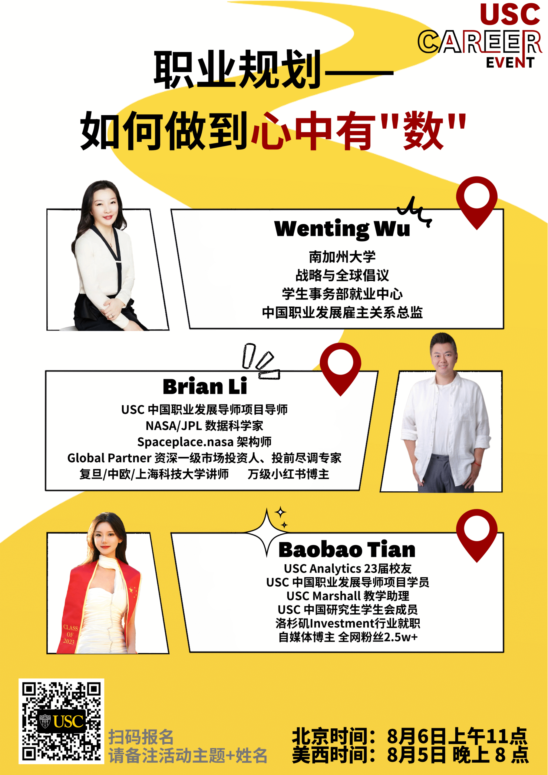 欢迎参加2024年8月6日北京时间上午11: 00 南加州大学国际学院举办的在线讲座《职业规划-如何做到心中有“数”》。马上注册!