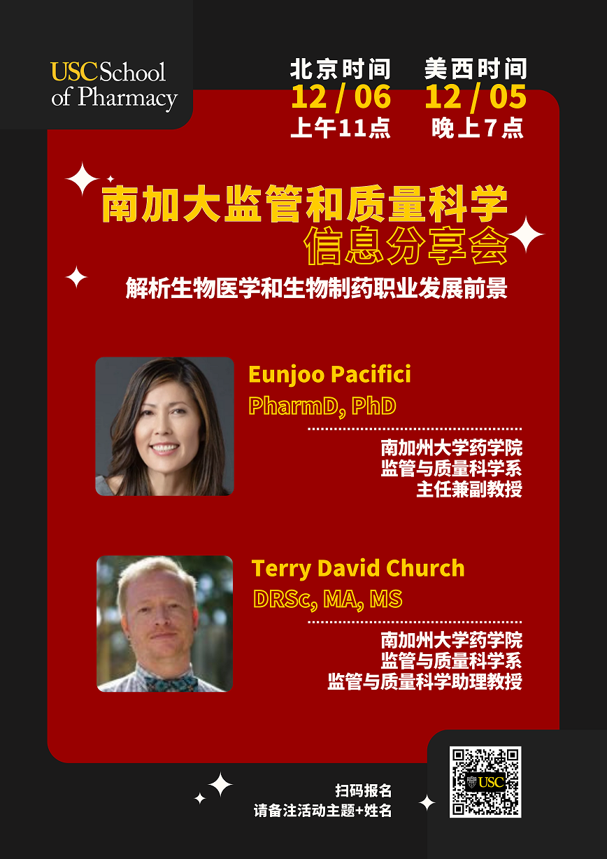 欢迎参加2022年12月6日北京时间上午11:00南加州大学药学院举办的在线讲座《南加大监管与质量科学信息分享会 -解析生物医学和生物制药职业发展前景》。马上注册!