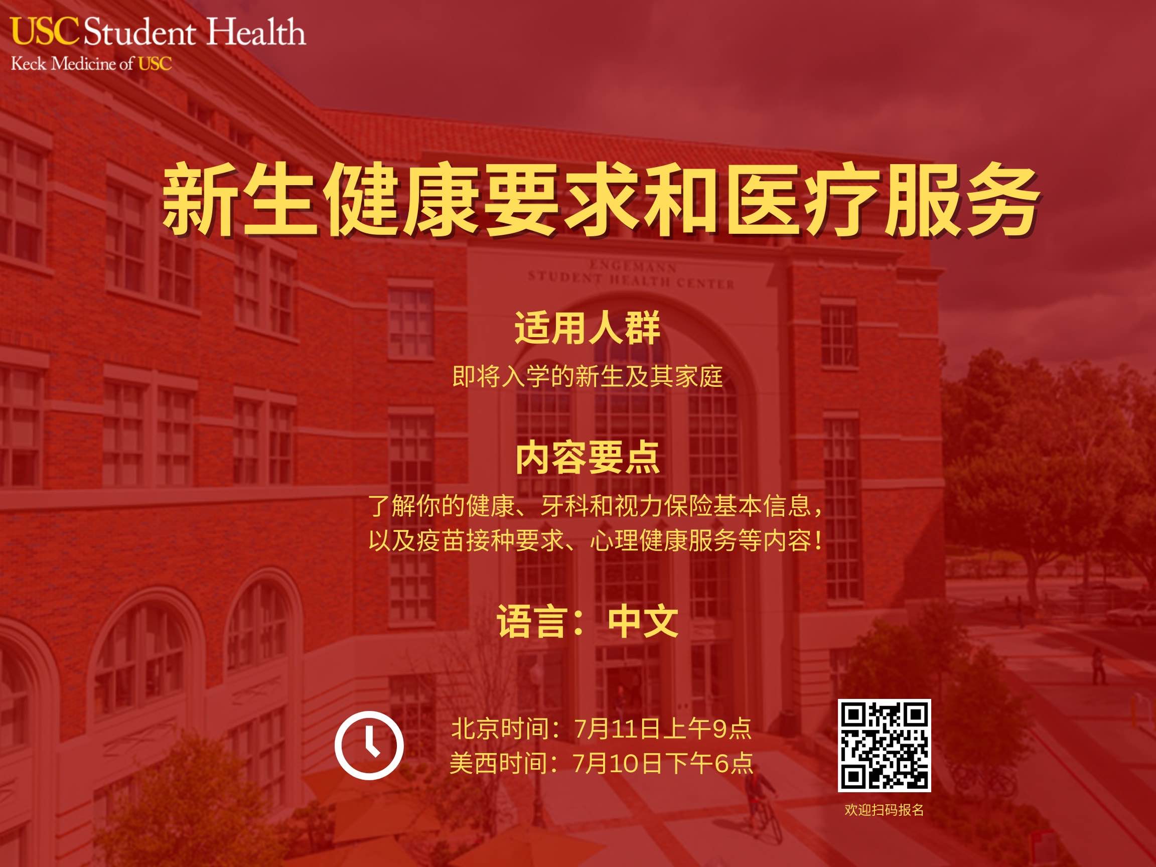 欢迎参加2025年7月11日北京时间上午9:00南加州大学学生健康中心举办的在线讲座《新生健康要求和医疗服务》。马上注册!