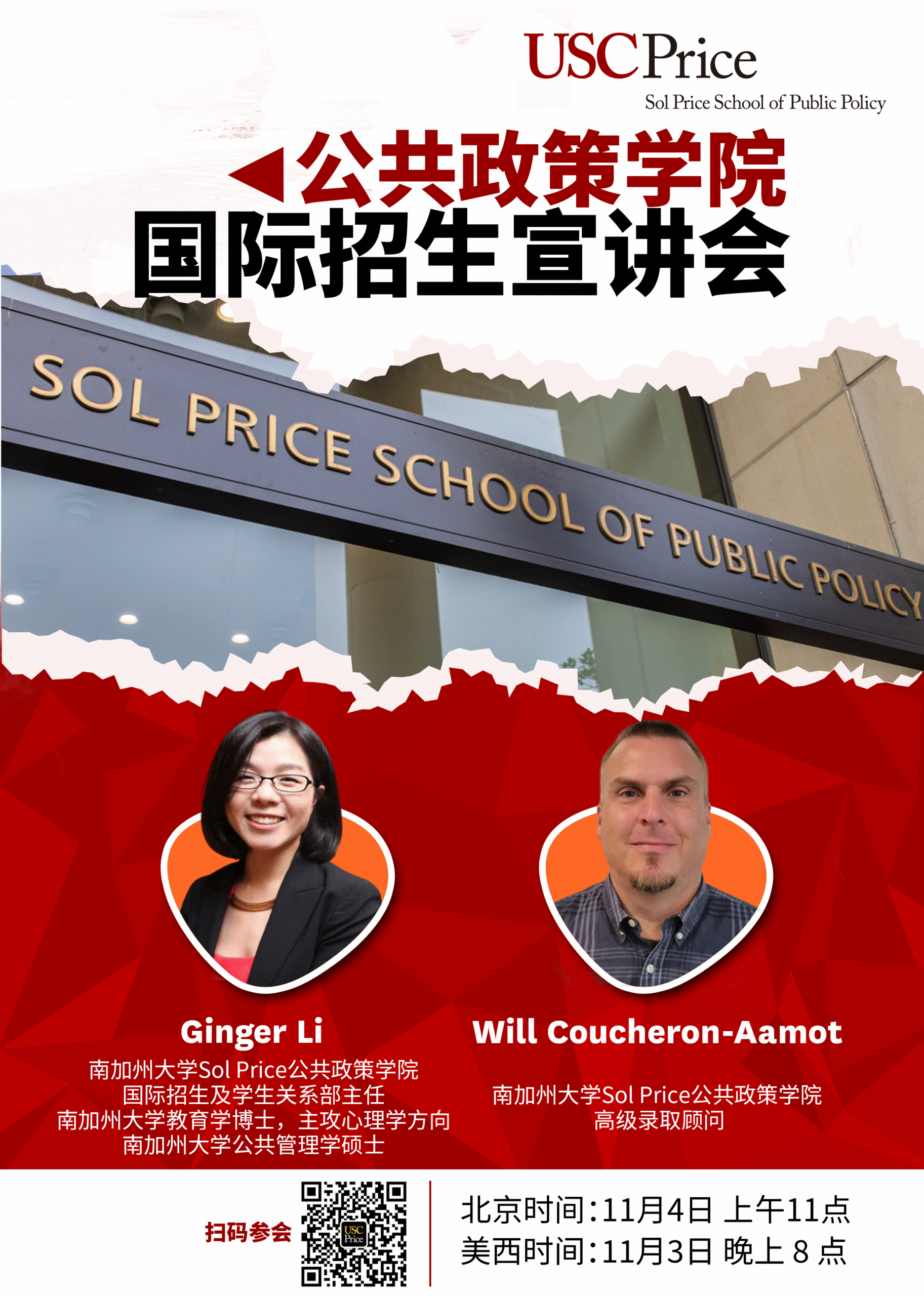 欢迎参加2022年11月4日北京时间上午11:00南加州大学Sol Price国际公共政策学院举办的在线讲座《公共政策学院国际招生宣讲会》。马上注册!